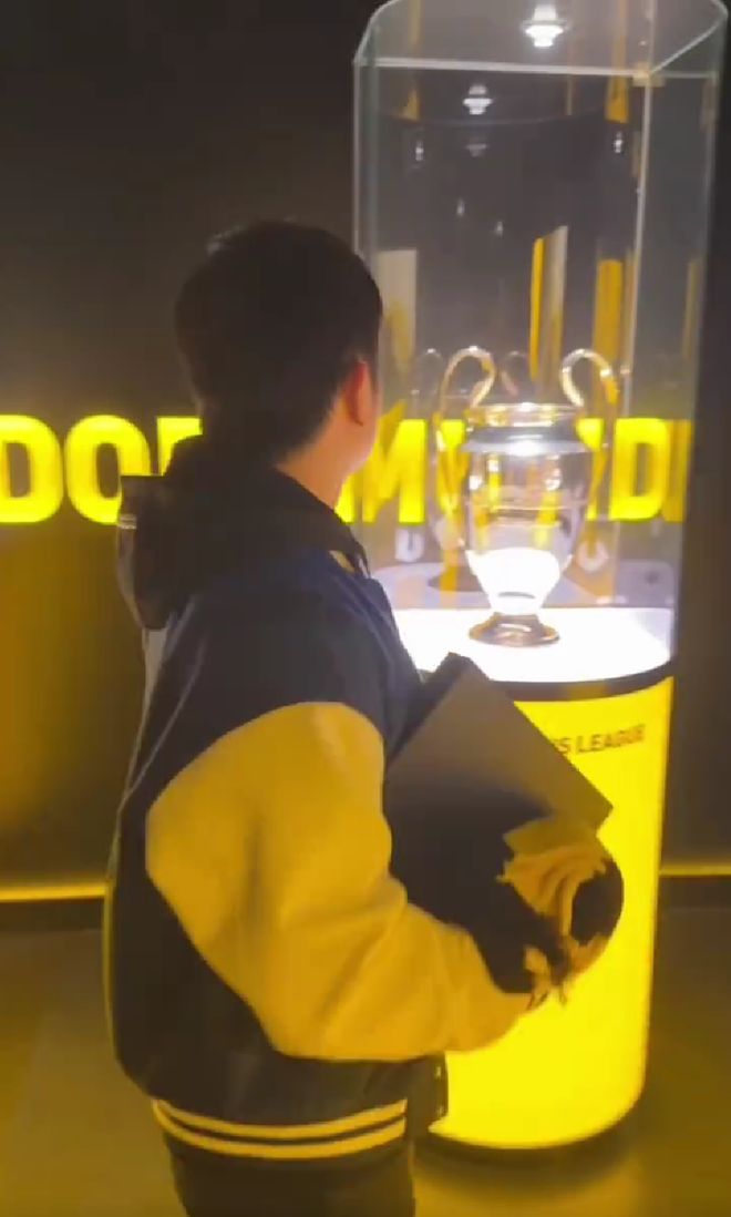 比赛开始前,波尔带樊振东参观了多特蒙德的奖杯展示室。首先映入眼帘的是1997年的欧冠奖杯和多特蒙德。1997年欧冠决赛,多特蒙德3-1击败尤文图斯,在慕尼黑奥林匹克球场夺得欧冠冠军,也是德甲历史上除拜仁之外唯一一支夺得欧冠冠军的球队。